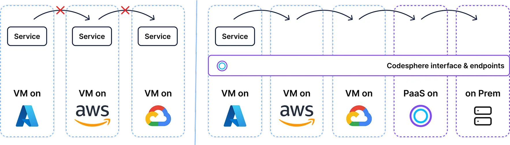 You can also use Codesphere to connect multiple datacenter on different clouds & infrastructure to a unified frontend. This is great for companies that run in scenarios where multiple locations need to be serviced by centralized development teams.